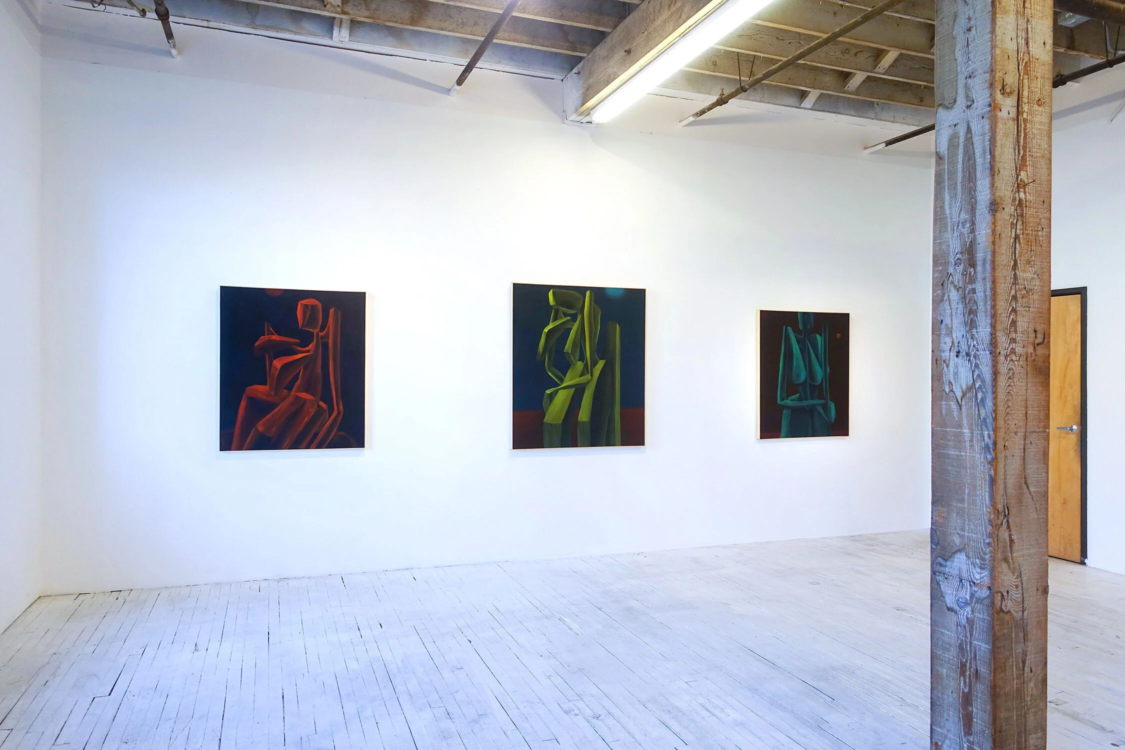 In each of the six paintings exhibited, a somber palette reflects the mood of the subject. Without faces, their body language alludes to their despair as each figure struggles to fit within the boundaries of their canvas. To cope with its limited surroundings, the Assiduous Being seems to cradle itself, lost in a barren landscape of earthen clay beneath a deep green horizon. The seated figure seems to nonetheless indicate the perseverance and courage the world has taken to adapt to a new quotidian existence.