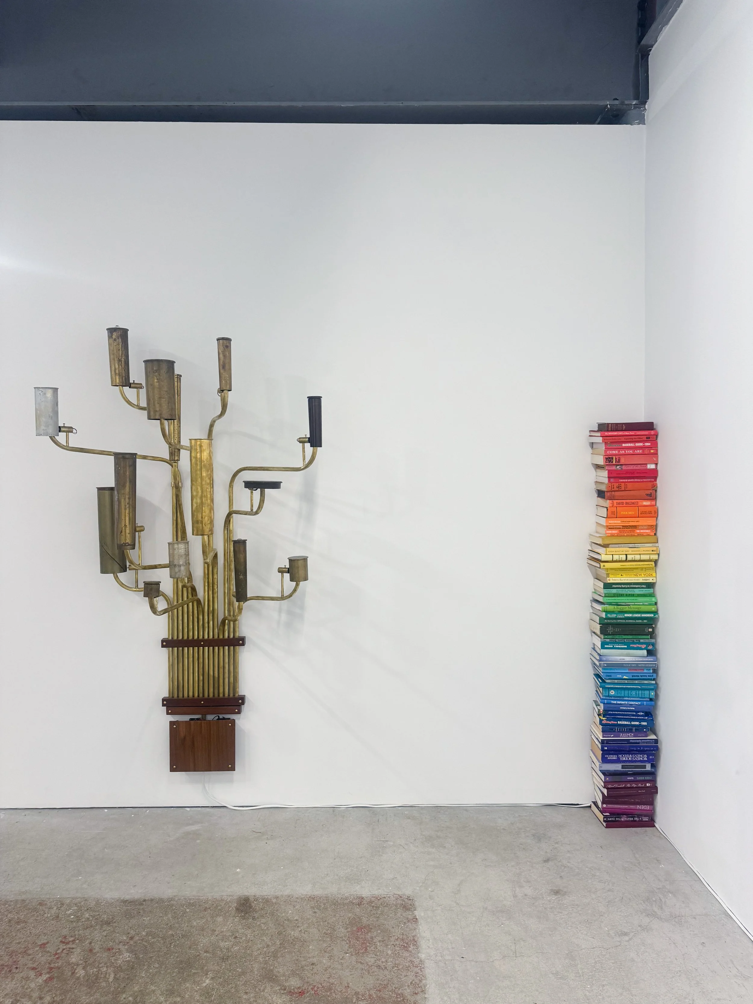Sculptural works defined by stillness and balance border others brimming with potential energy, inviting interaction and movement. Will Rogan’s Double Zero (Textured) displays a feat of tremendous balance, using gravity as the only tool to hold a single domino vertically atop a long, thin piece of wood. The work recalls Kos’ Equilbre series of balanced brooms placed vertically on the floor, often topped with wire-strung lightbulbs and bells. Nearby, a stack of color-coded books matching the height of Kos by Chris Cobb (Untitled, 2024) demonstrates similar holding power, beckoning the viewer to ponder the non-mechanical nature of construction and balance.